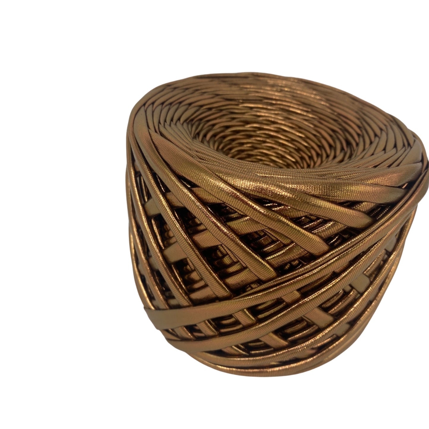 Metallic tshirt yarn is a quality yarn, made of 100% polyester with metal spraying. Without knots, stitches, and differences in width. LOOK LETAHER YARN