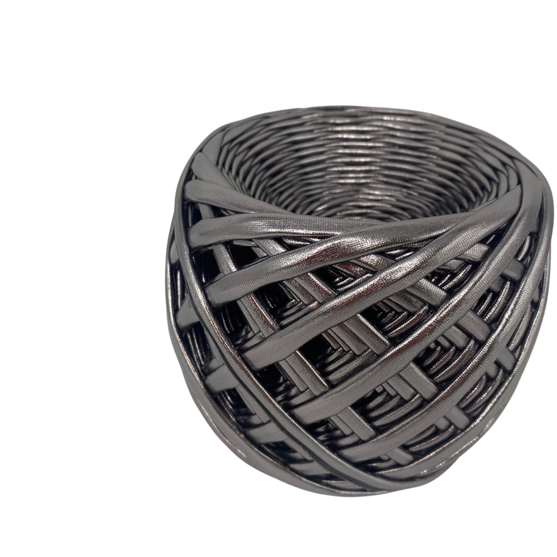 Metallic tshirt yarn is a quality yarn, made of 100% polyester with metal spraying. Without knots, stitches, and differences in width. LOOK LETAHER YARN