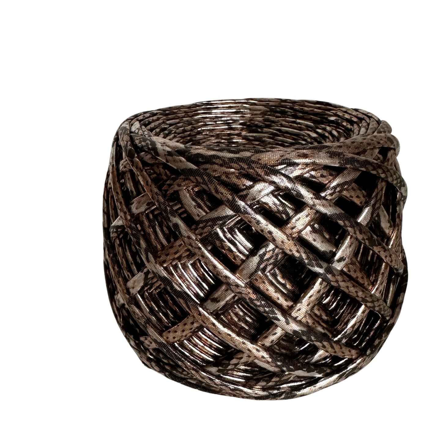 Metallic tshirt yarn is a quality yarn, made of 100% polyester with metal spraying. Without knots, stitches, and differences in width. LOOK LETAHER YARN
