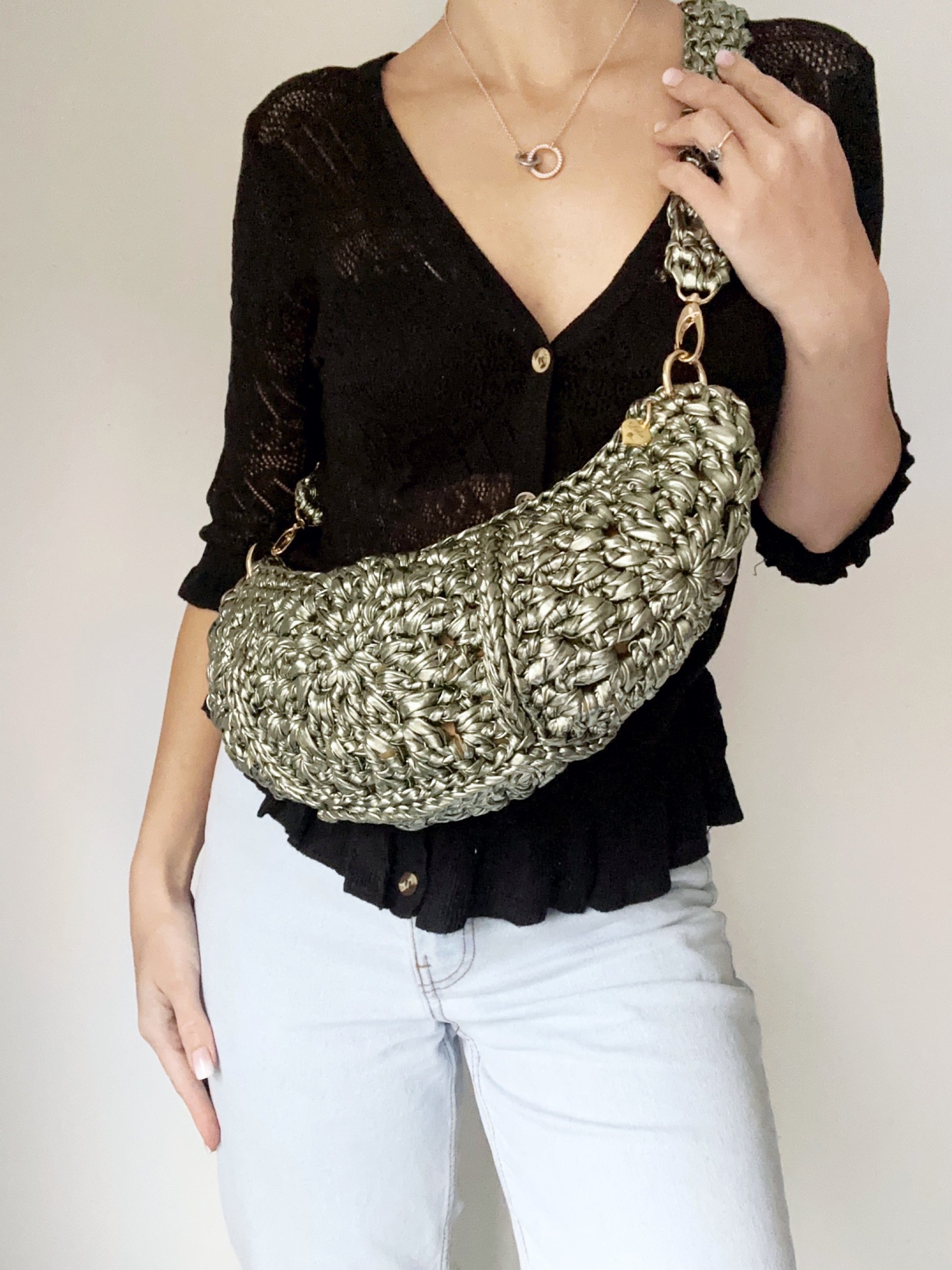 Granny Square Bag a lovely waist bag braided with a crochet method. The Bag can be worn in different ways. The comfortable stap can be detached.