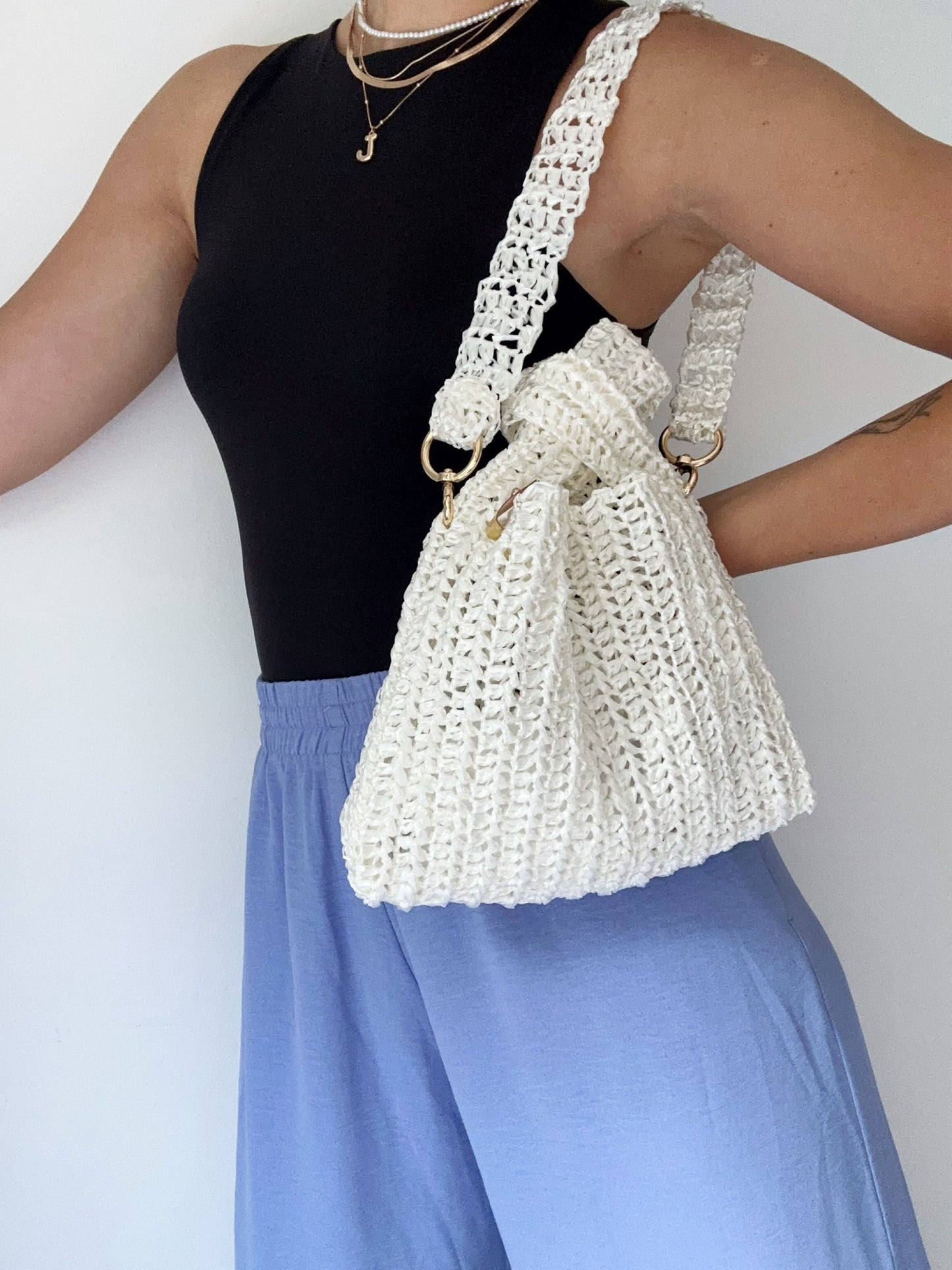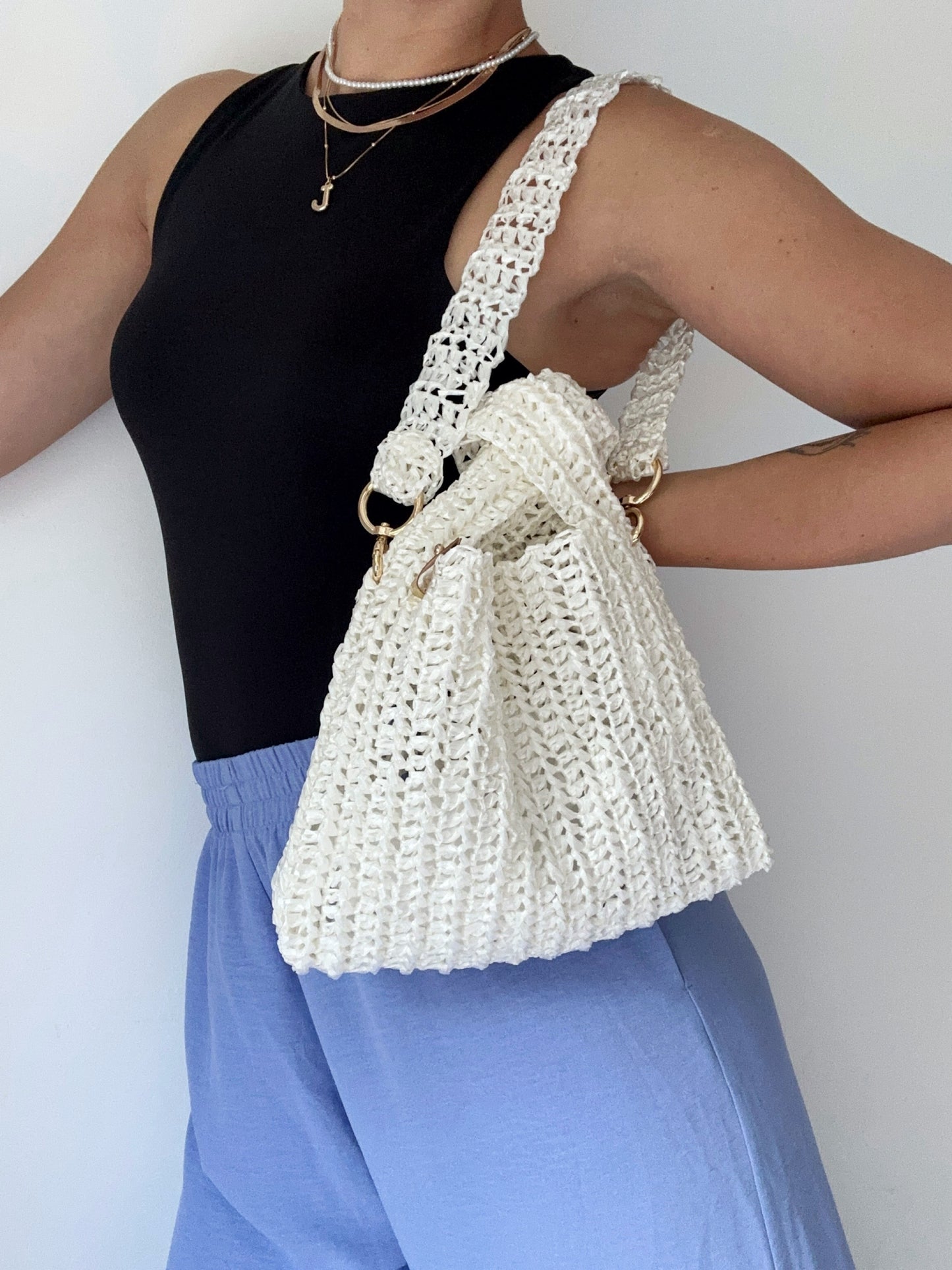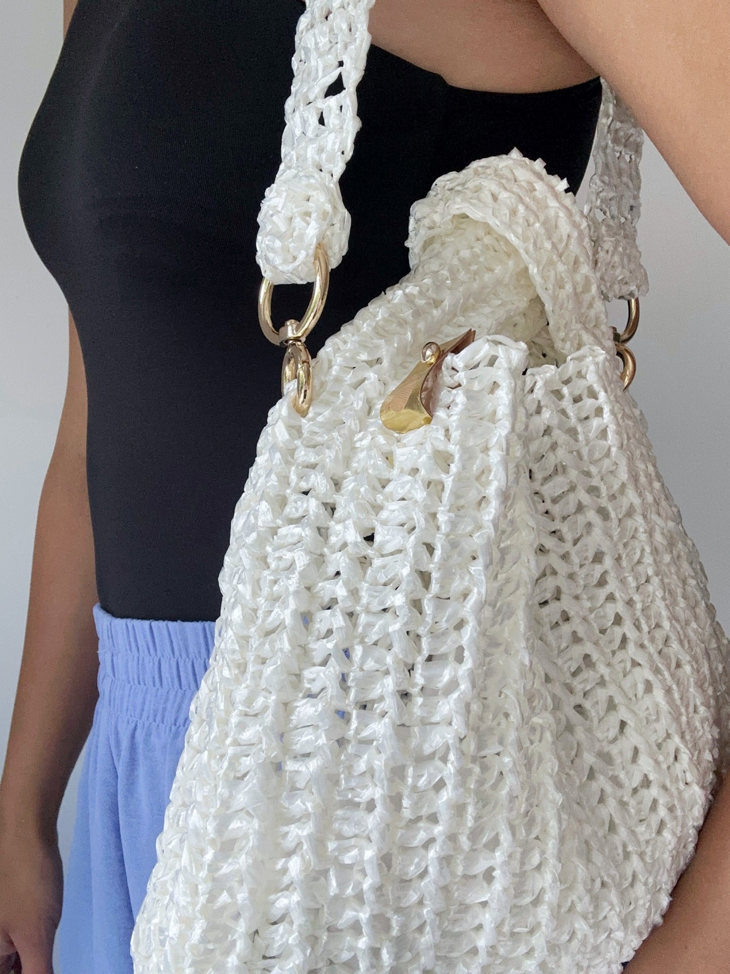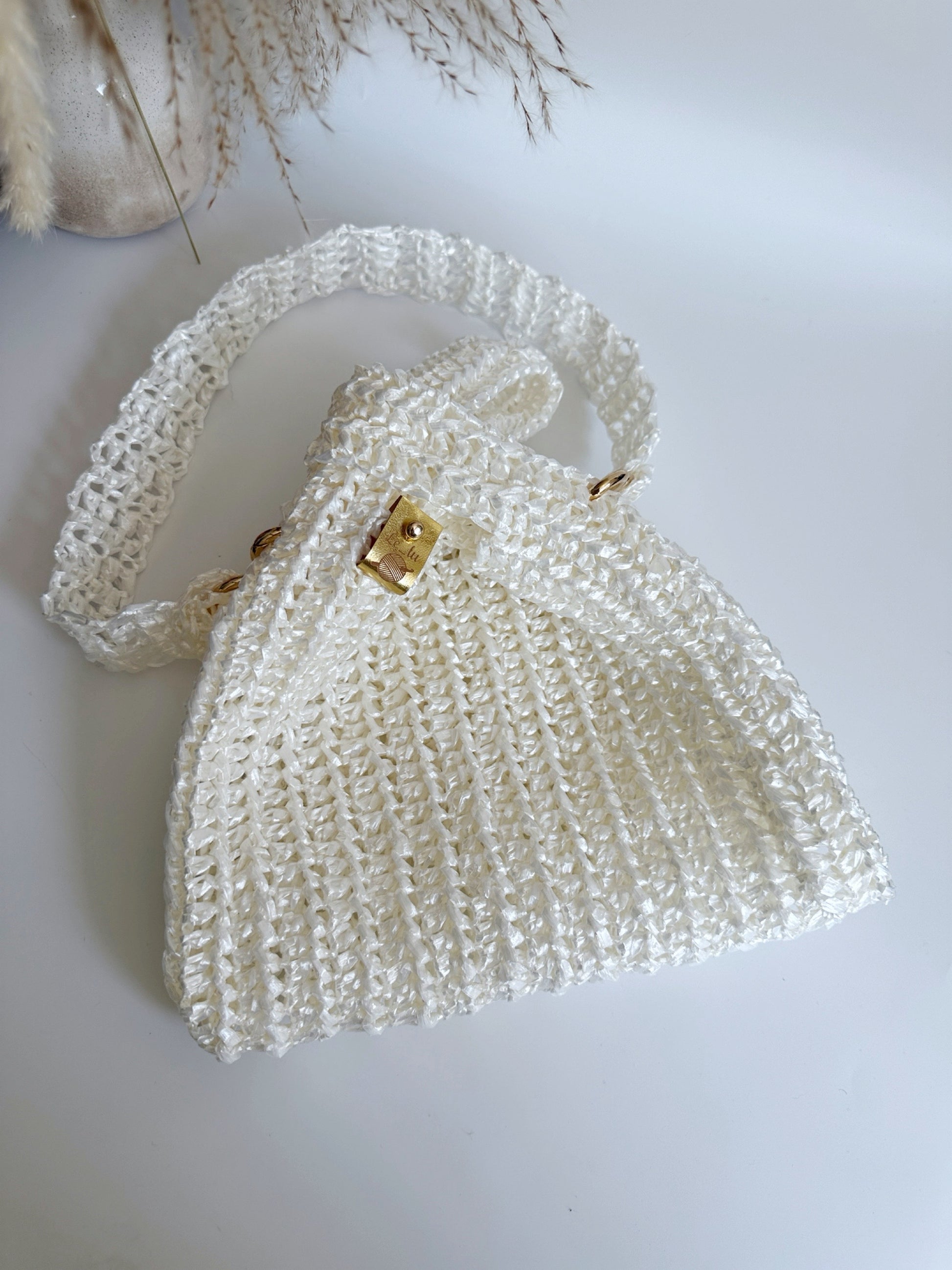 This handmade bag exudes a unique summer vibe with its shine white color and artisanal touch. It's perfect for adding a pop of personality to any outfit this season. A shine white handbag, designed for women who value both nature and aesthetics, combines eco-friendly materials with elegant, minimalist design. Additional detachable strap 70cm.