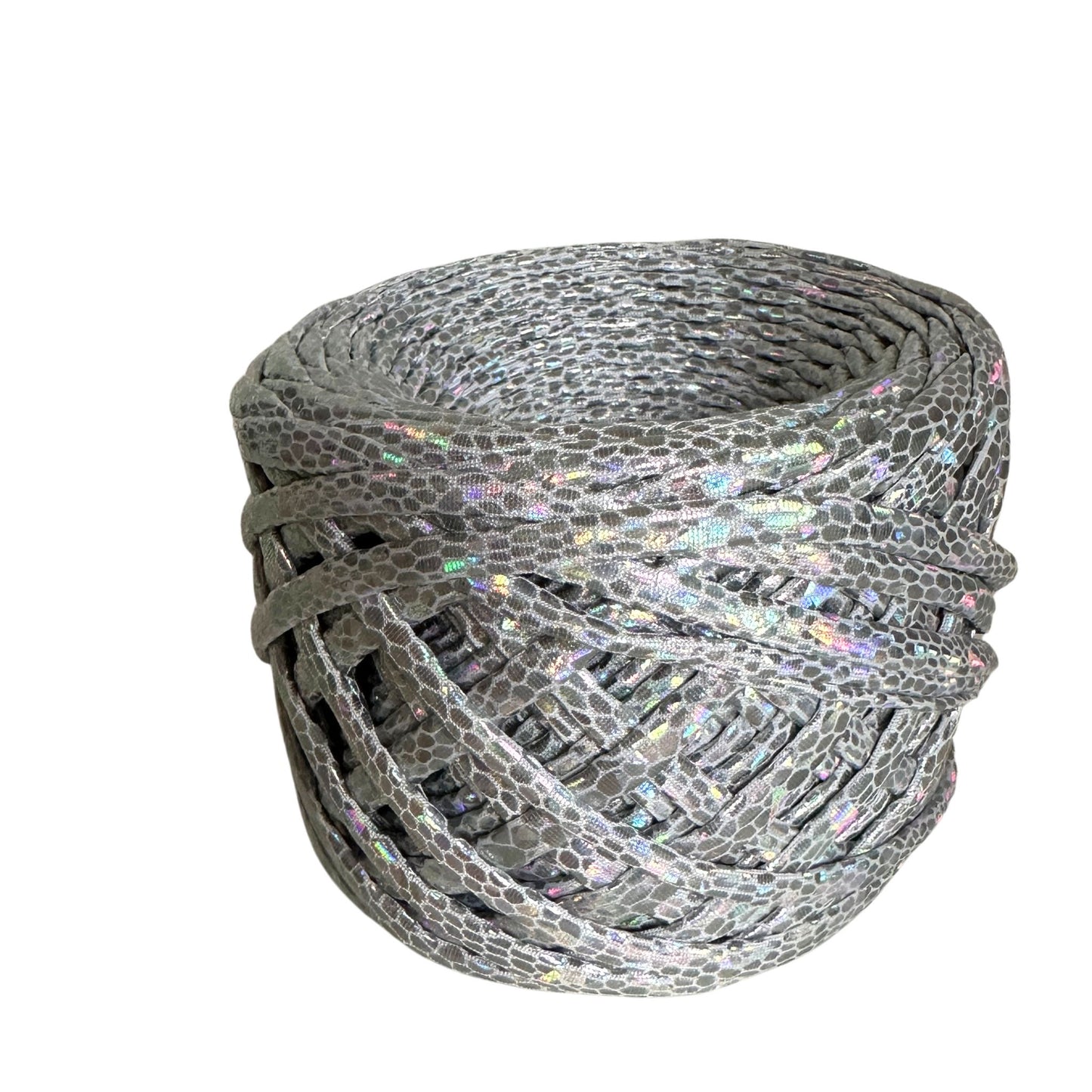 Metallic tshirt yarn is a quality yarn, made of 100% polyester with metal spraying. Without knots, stitches, and differences in width. LOOK LETAHER YARN