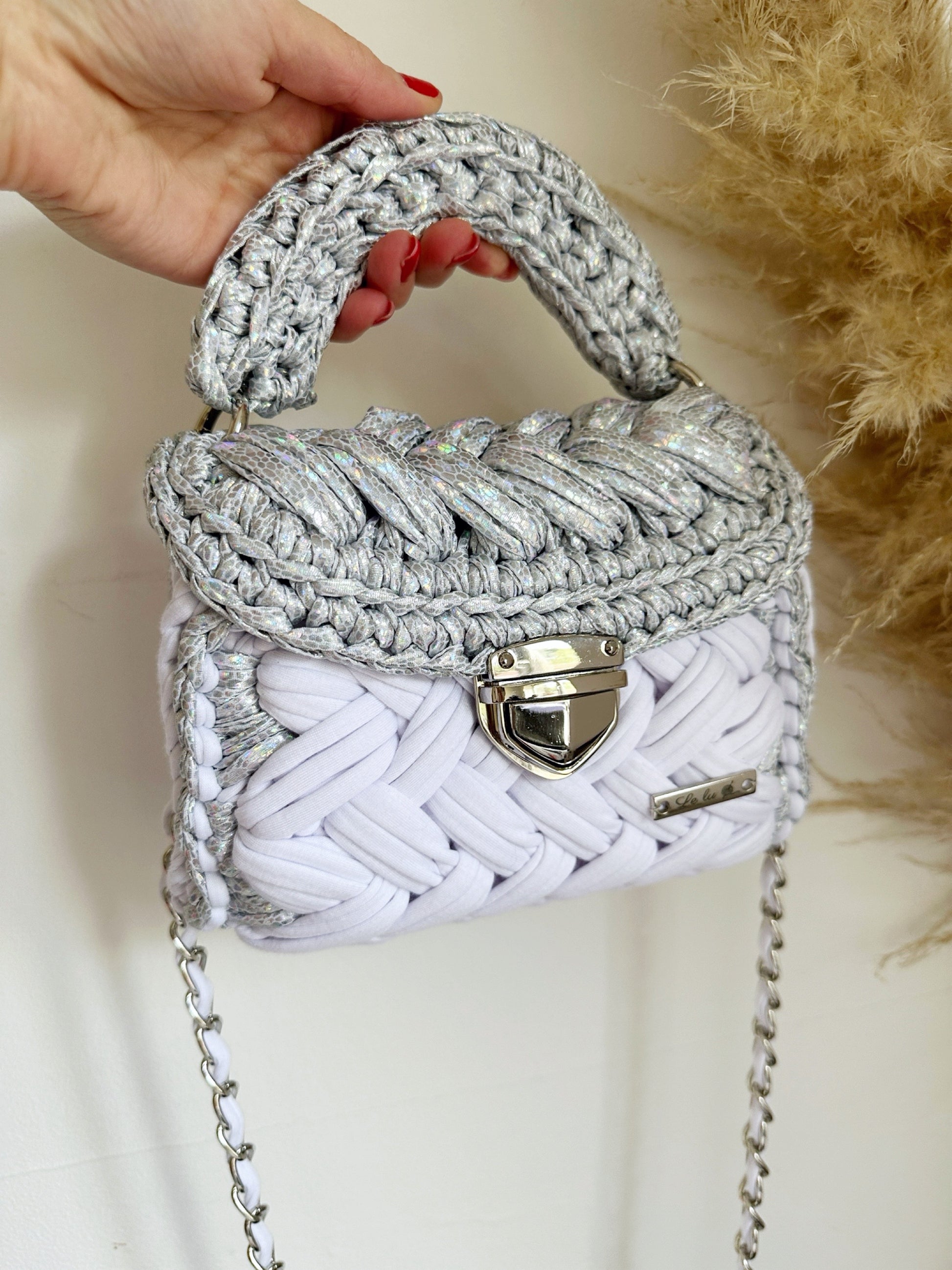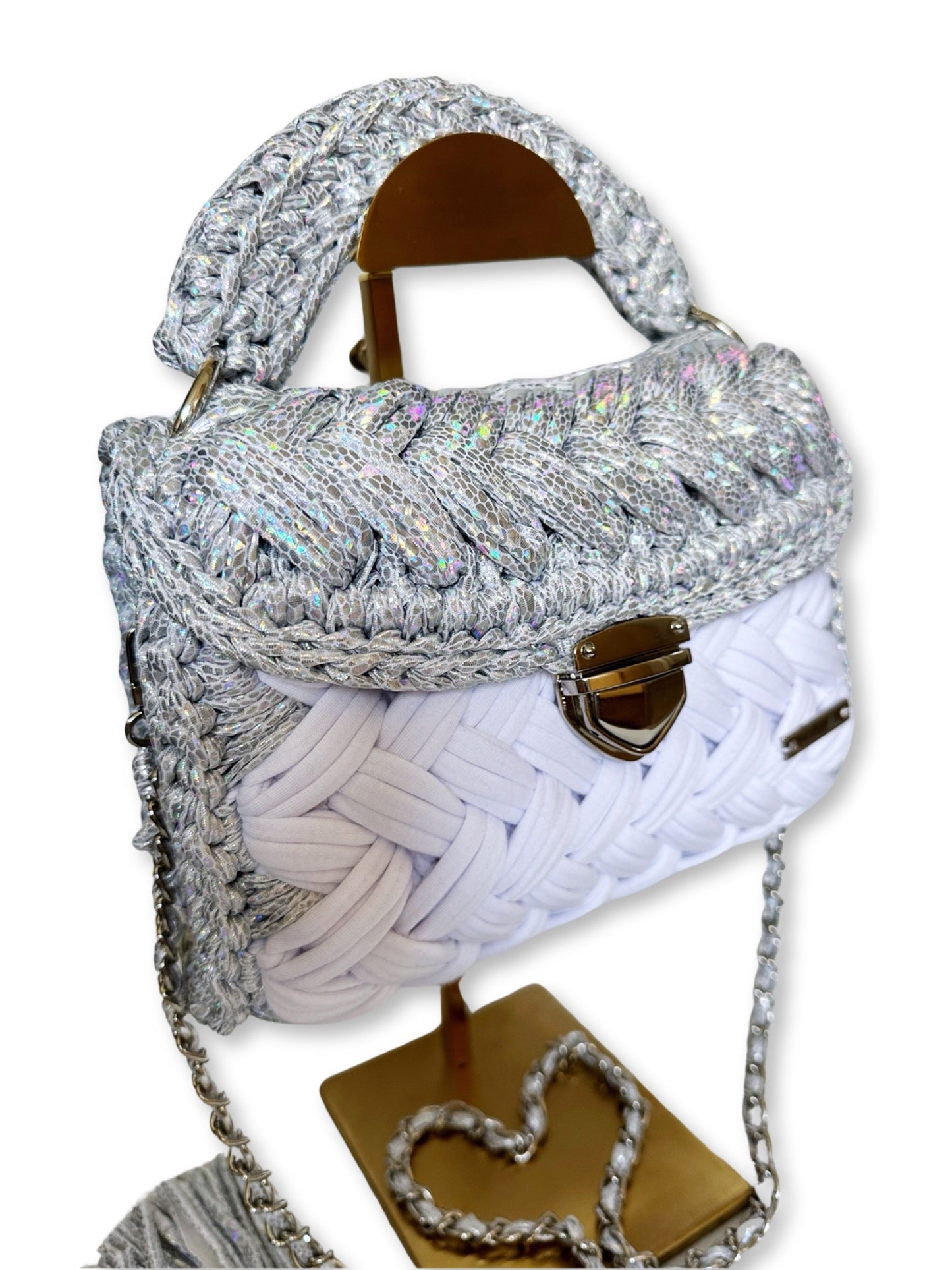 Handcrafted from the premium 100% cotton material and 100% metallic shine material look leather, the top handle bag design features our signature metal logo Lelu. A metallic shine decorative flap secured with a metal clasp gives the bag a unique details.