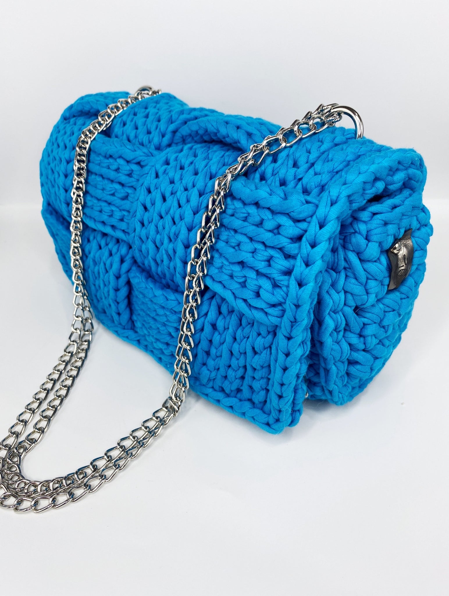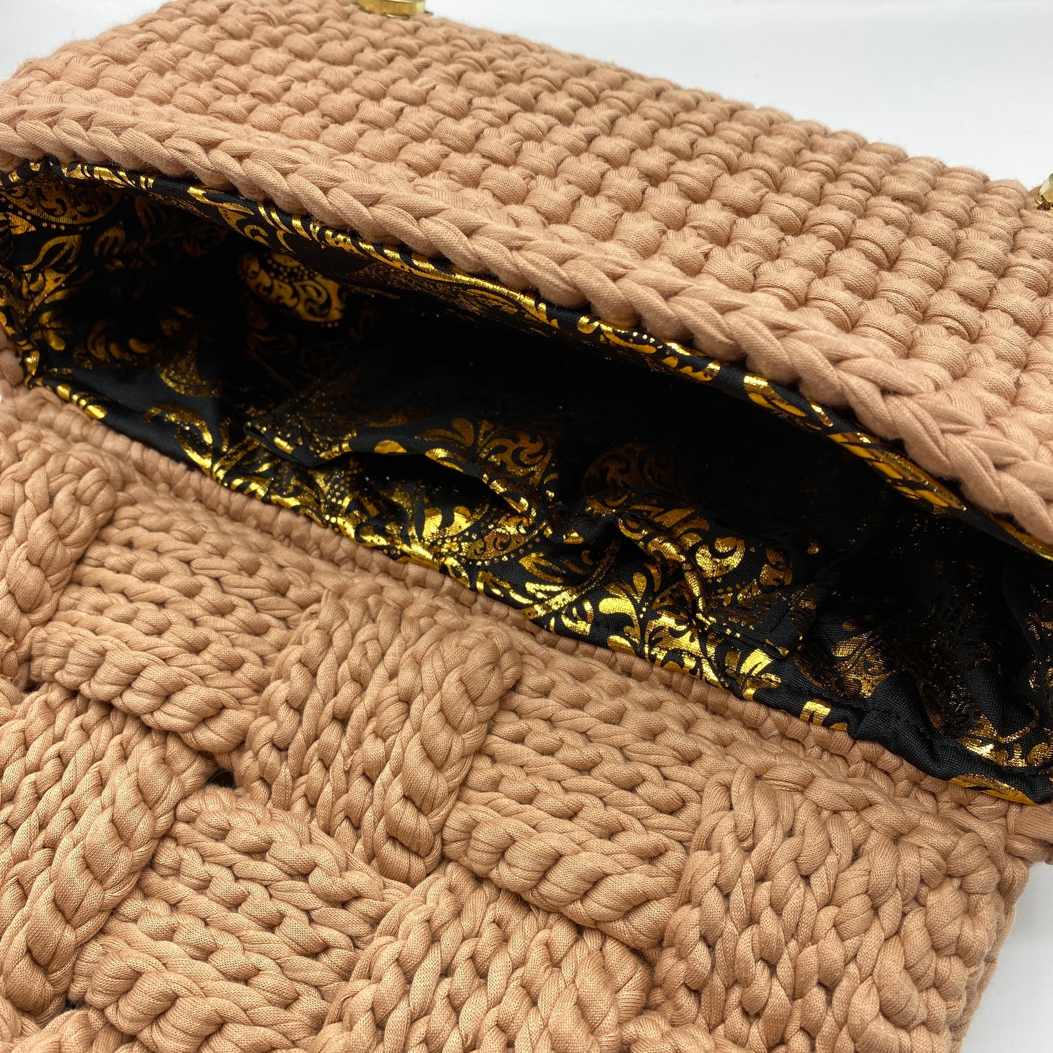 Handcrafted crochet unique flap complemented by premium 100% cotton material, giving a functional edge to the compact yet spacious design.