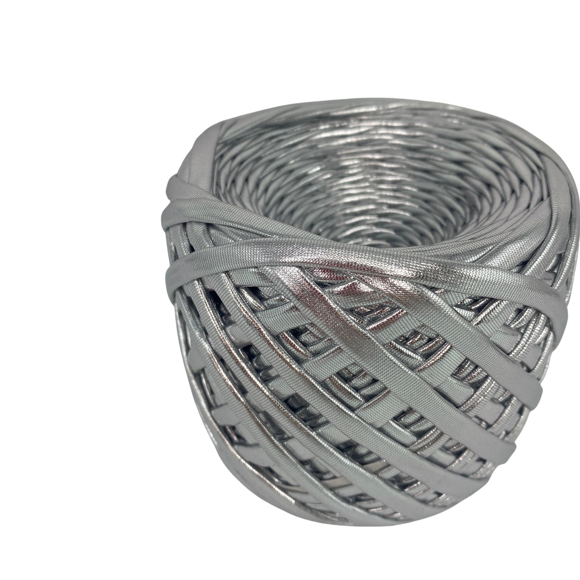 Metallic tshirt yarn is a quality yarn, made of 100% polyester with metal spraying. Without knots, stitches, and differences in width. LOOK LETAHER YARN