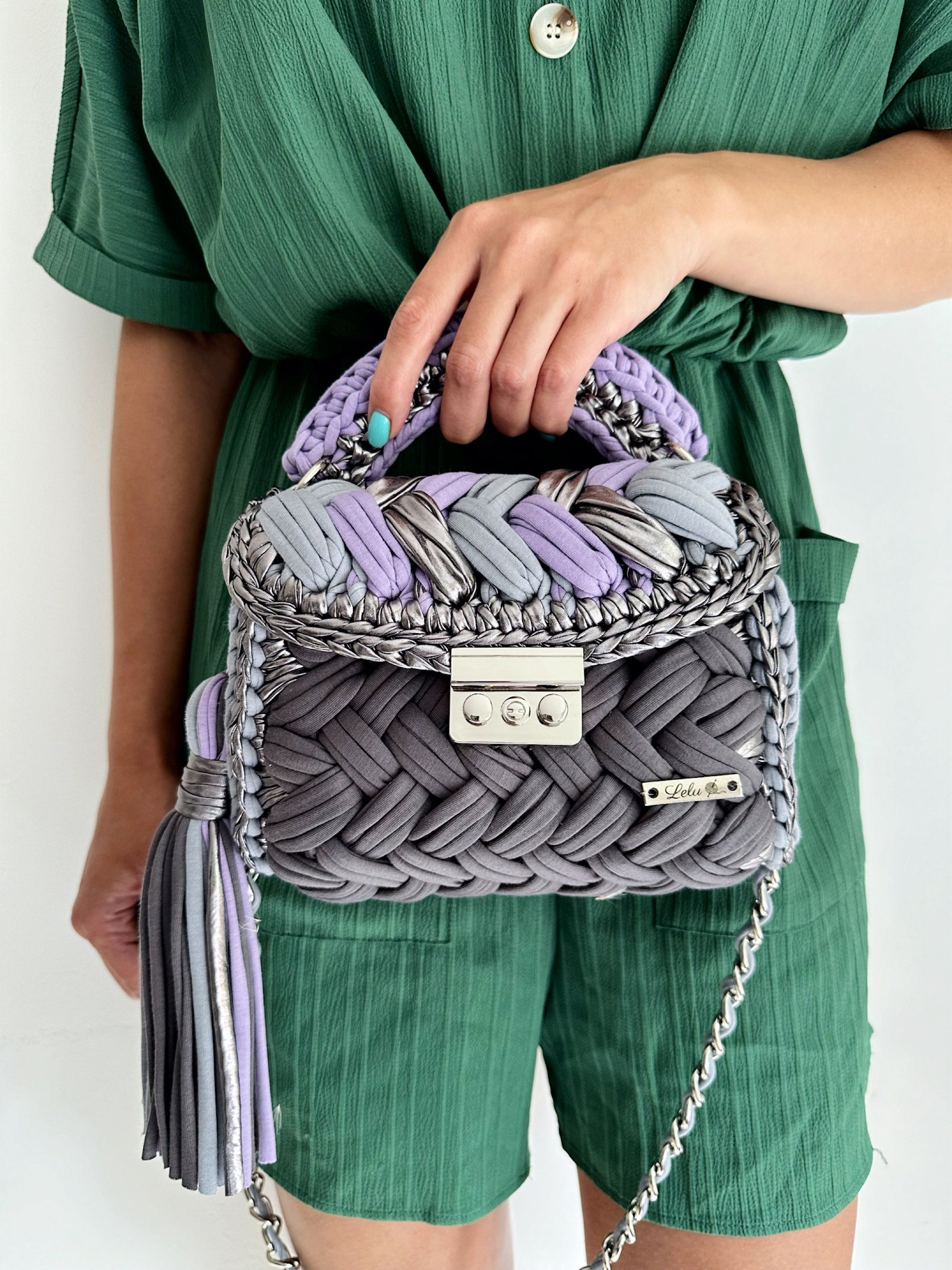 Handcrafted from the premium 100% cotton material and 100% metallic shine material look leather, the top handle bag design features our signature metal logo Lelu.